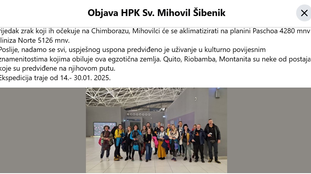 “Nakon,nadamo se svi, uspješnog uspona predviđeno je uživanje u kulturno povijesnim znamenitostima kojima obiluje ova egzotična zemlja. Quito, Riobamba, Montanita su neke od postaja koje su predviđene na njihovom putu”, napisali su Mihovilci na svom Facebook profilu.