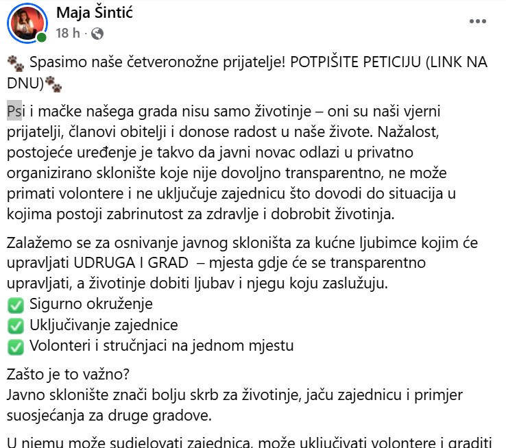 'Psi i mačke našega grada nisu samo životinje – oni su naši vjerni prijatelji, članovi obitelji i donose radost u naše živote. Nažalost, postojeće uređenje je takvo da javni novac odlazi u privatno organizirano sklonište koje nije dovoljno transparentno, ne može primati volontere i ne uključuje zajednicu što dovodi do situacija u kojima postoji zabrinutost za zdravlje i dobrobit životinja.