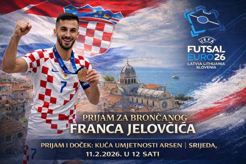 Šibenik će svečano dočekati i slaviti velebni uspjeh kapetana futsalske reprezentacije Hrvatske Franca Jelovčića koja je osvojila brončanu medalju ne Prvenstvu Europe. Doček i slavu uspjeha organiziraju Grad Šibenik i Zajednica sportova Grada Šibenika, a bit će održani u srijedu, 11. veljače 2026. godine u 12 sati u Kući umjetnosti “Arsen”.