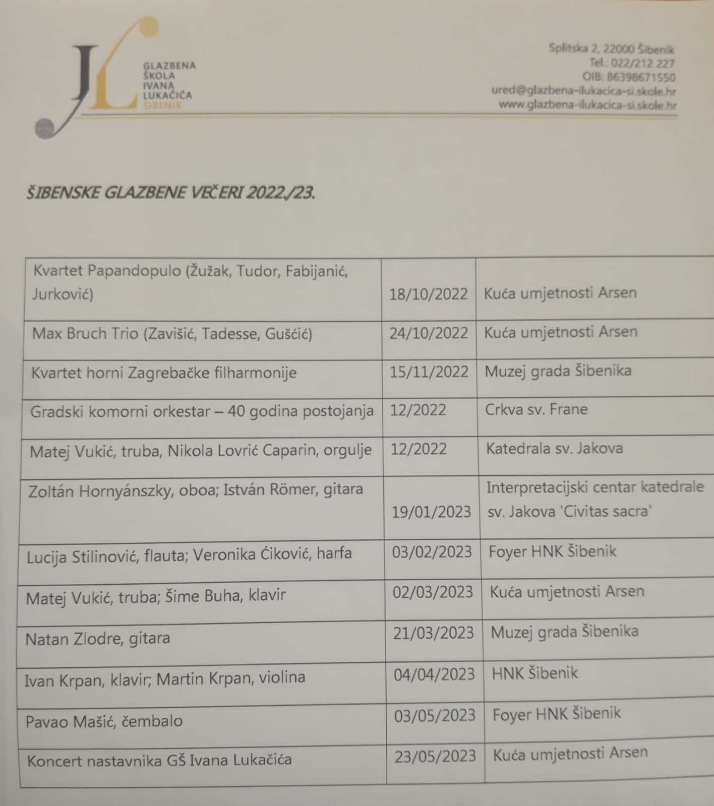Koncertni ciklus počinje u listopadu ove godine s dva koncertna gostovanja koja se održavaju uz potporu Ministarstva kulture i medija. Nastupi će Kvartet Papandopulo i Max Bruch Trio. O Koncerti će se održavati u Kući umjetnosti Arsen, Muzeju grada Šibenika, Hrvatskom narodnom kazalište Šibenik, Interpretacijskom centar katedrale sv. Jakova Civitas Sacra, Katedrali sv. Jakova i sv. Frane