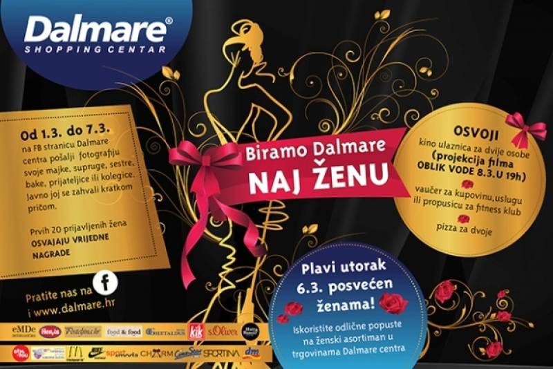 Reći hvala naj majci, supruzi, baki, prijateljici, šefici, kolegici s posla, djevojci neće vam biti problem pratite li korake nagradne igre "Dalmare naj žena". Akcija je organizirana na Facebook stranici Dalmare centra 1. do 7. ožujka. Potrebno je samo staviti sliku vama drage ženske osobe i napisati zašto zaslužuje titulu naj žene. Požurite jer prvih 20 prijavljenih žena osvaja brojne nagrade brendova iz Dalmare centra, posebnu projekciju filma za dvoje u Cinestaru i pizzu za dvoje u restoranu Food & Food
