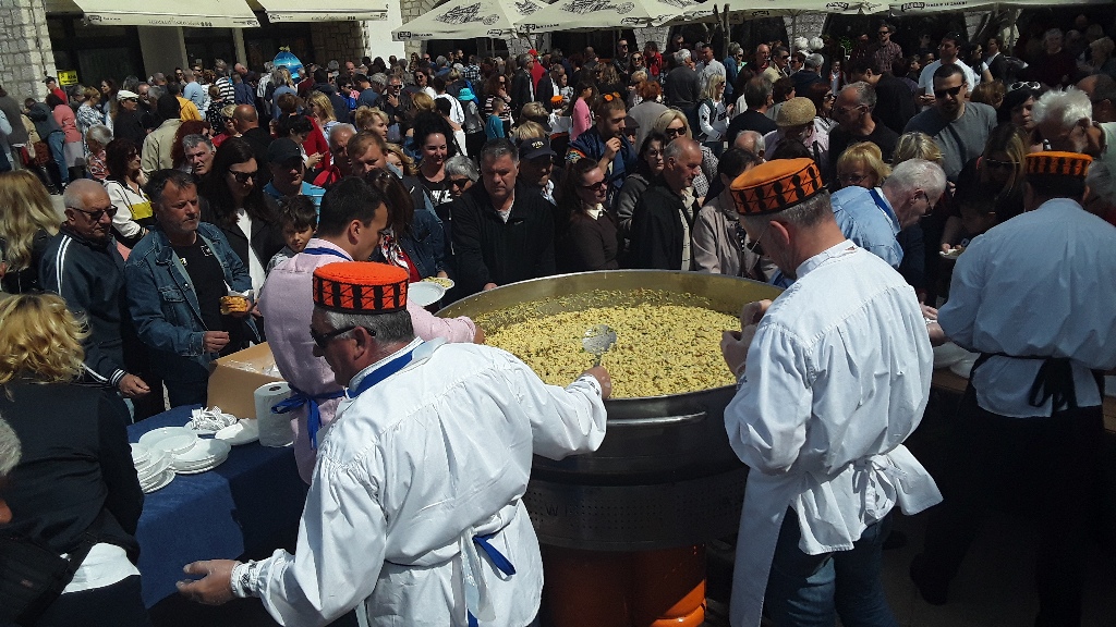 Tradicionalni Uskrsni doručak poslužen je i danas Šibenčanima i gostima Šibenika na trgu ispred zgrade Šibensko - kninske županije u organizaciji Udruženja obrtnika Šibenik s već tradicionalnom ponudom - fritajom sa slaninom i šparogama te suhomesnatim proizvodima. Organizatori su posjetitelje malo izgladnjeli jer je umjesto u 10.30 , kako je bilo najavljeno dijeljenje besplatnih obroka počela oko 11.30. ali su isto tako vrlo brzo planuli. Dok se čekala hrana bio je organiziran kulturno - umjetnički program na kojem su nastupile dječje folklorne grupe i šibenske Šuštine, a okupljene je pozdravio i čestitao im uskrs šibenski gradonačelnik Željko Burić. Poslije toga ih je zabavlja klapa More.