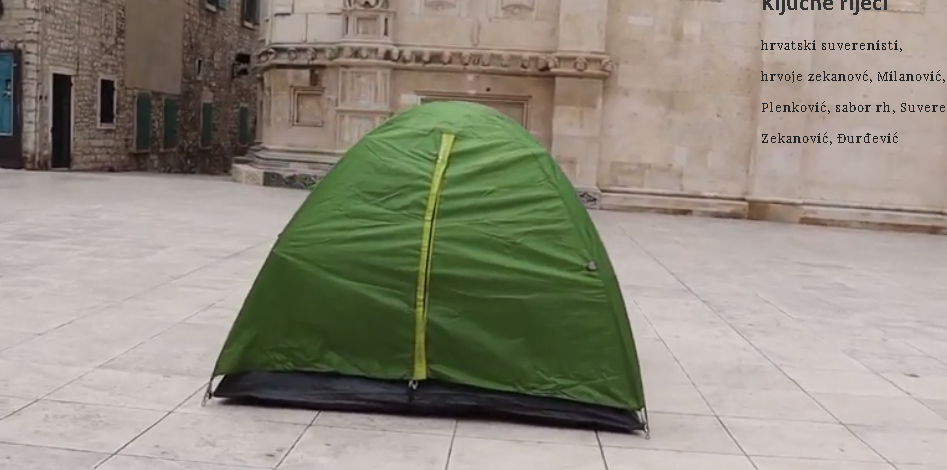 Hrvoje Zekanović, kandidat Hrvatski suverenista za gradonačelnika Grada Šibenika podigao je jučer poslijepodne mali šator na trgu između katedrale i Gradske vijećnice u Šibeniku aludirajući na plan gradske vlasti na na tvrđavi svetog Ivana kao šibenskoj baštini podigne turski šator YURT .