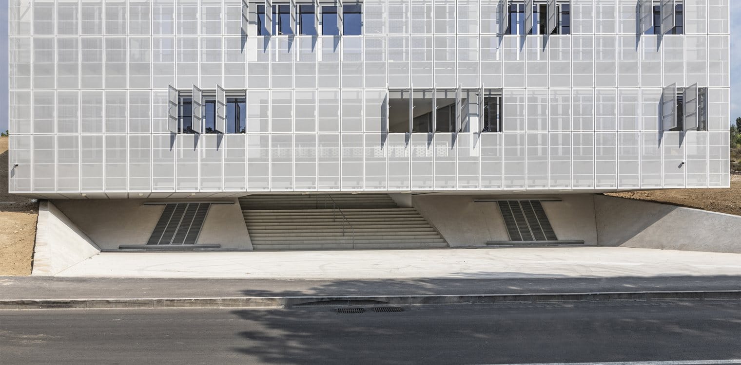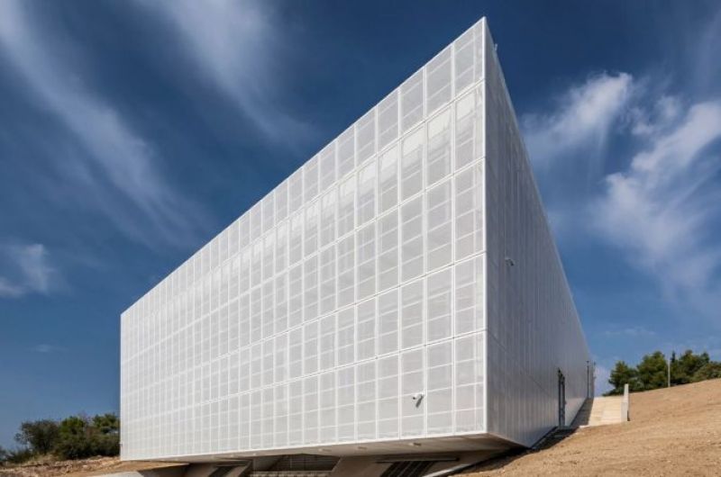 Južno orijentirana padina na gradskoj periferiji, s ograničenim pogledima na more i grad, utjecala je na koncept introvertirane, no ne i potpuno hermetički zatvorene građevine. Ona se sastoji od tri osnovna formalna elementa: proširene komunikacije u sredini, upuštene armirano-betonske baze podruma i konzolnog betonskog lebdećeg volumena koji je vizualno olakšan prozračnom fasadom od perforiranog bijelog lima.
