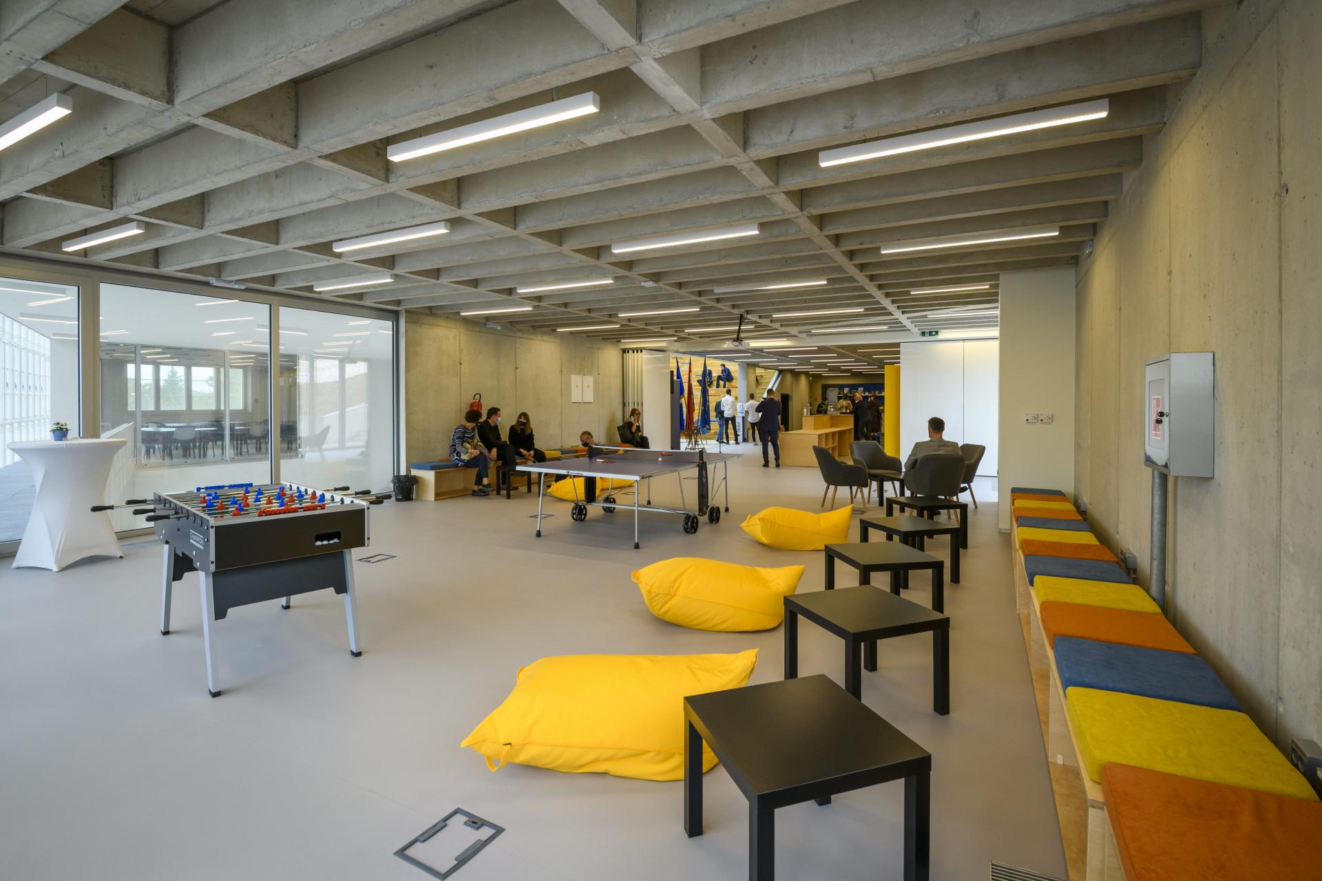 Oko središnjeg ostakljenog atrija s tribinom smješteni su različiti tipovi radnih prostora – fleksibilni uz cafe bar i tribinu, fiksni u otvorenom prostoru te zatvoreni uredi. Također je moguće družiti se i raditi na pultu uz ogradu oko atrija. Uvjeti za kvalitetan rad u otvorenom prostoru ostvareni su dodavanjem zvučno izoliranih kabina i ureda za sastanke u kojima se nalaze i stolovi za stolni tenis.