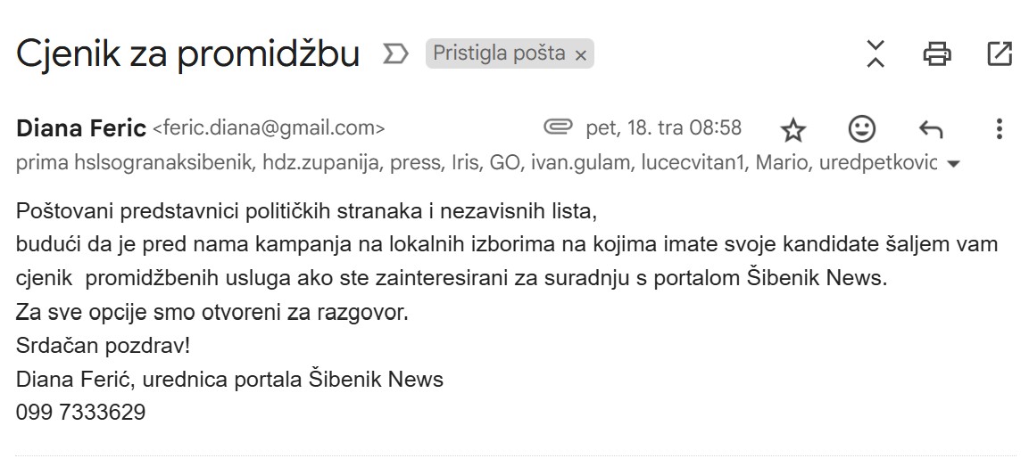 Drugo, SDP-u sam, dakle i Restoviću kao kandidatu te stranke za gradonačelnika Šibenika, kao i svim ostalim strankama i listama pred početak službene kampanje poslala ponudu za promidžbu. Naravno, nije odgovorio. Nije javio ni da ponudu ne prihvaća, nije poručio da nije zainteresiran ili barem odbijenicom zahvalio na ponudi. Budući da nije prihvatio ponudu za promidžbu svoje kampanje na portalu ŠibenikNews, možda zato što mu taj portal nije zanimljiv ili zato što je procijenio da nije dovoljno utjecajan da bi od pojavljivana na njemu u izbornoj kampanji imao koristi što je asolutno legitimno, njega i njege liste nije bilo na portalu ŠibenikNews za razliku od drugih kandidata i stranaka, dakle i HDZ-a koji su ponudu prihvatli, ocijenili da im je korisno pojaviti se na ŠibenikNewsu i uredno platiti cijenu oglašavanja. Svi izborni promidžbeni sadržaju na portalu ŠibenikNews bili su regularno označeni kao PROMO, dakle kao plaćena promidžba kod koje se podarazumijeva da ne odražava stavove, mišljenja i politička opredjeljenja Redakcije, novinara i vlasnika portala. Restović je valjda sve to htio, ali mukti, dakle bez plaćanja i očekujući da će trošak njegove izborne kampanje podnijeti nakladnici medija. S druge strane sigurno je platio usluge fotografa koji su ga slikali, tiskanja letaka i plakata, zakup jumbo plakata i ostale troškove kampanje. Dakle sve se plaća, ali bi za Restovića novinari i nakladnici trebali raditi besplatno, staviti mu na raspolaganje svoje znanje i medijske resurse. Sada, kada gubi izbore krivi su mu portal ŠibenikNews i Diana Ferić, čije je čak i besplatne ponude – odbio.