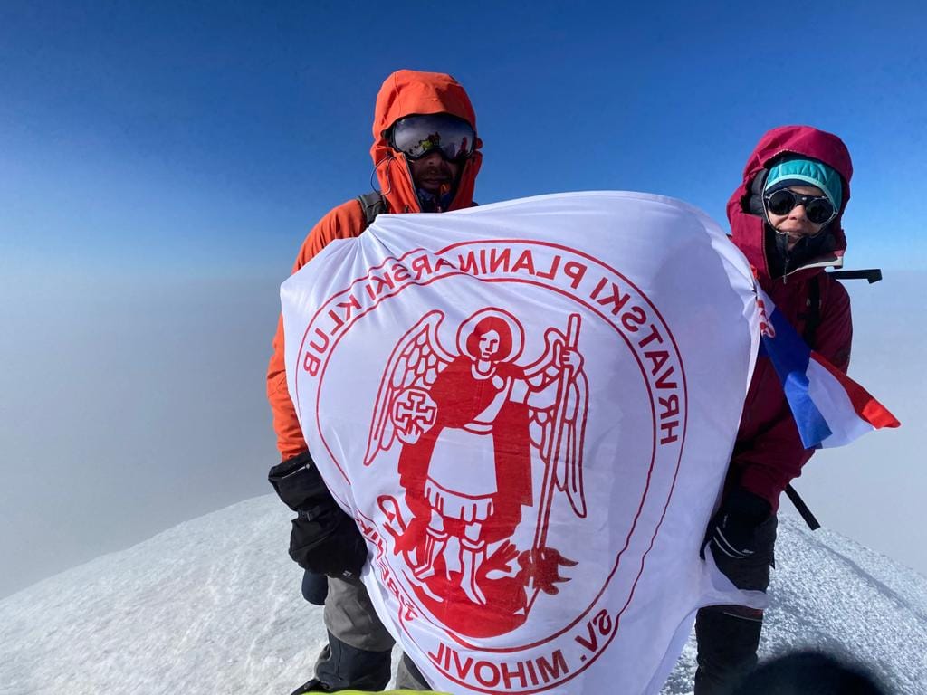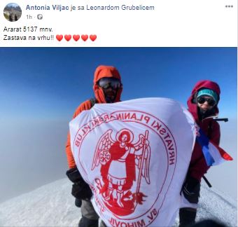 Zastava šibenskog planinarskog društva "sv. Mihovil zavijorila se danas na 5. 137 metara viskom vrhu planine Ararat u Turskoj. Postavili su je članovi tog društva Antonija Viljac i Leonardo Grubelić koji su su jutros kao dio veće hrvatske ekspedicije osvojili i taj vrh. Krenuli su na tu posljednju dionicu uspona noćas oko 2 sata. Antonia i Leonardo su fotografiju s 5137 metara nadmorske visine objavili na Facebooku.