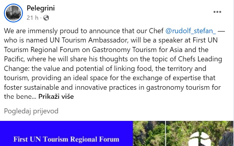 “Neizmjerno smo ponosni što možemo objaviti da će naš Chef @rudolf_stefan_ - koji je imenovan UN turističkim ambasadorom, biti govornik na Prvom UN-ovom turističkom regionalnom forumu o gastronomskom turizmu za Aziju i Pacifik, gdje će podijeliti svoja razmišljanja o temi Chefs Leading i potencijal povezivanja hrane, teritorija i turizma, pružajući idealan prostor za razmjenu stručnosti koje potiču održive i inovativne prakse u gastronomskom turizmu za dobrobit ljudi i planeta”, objavili su.