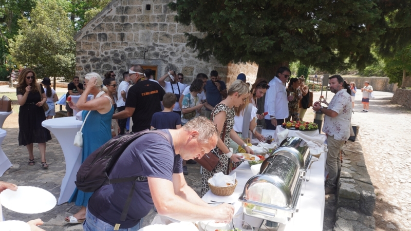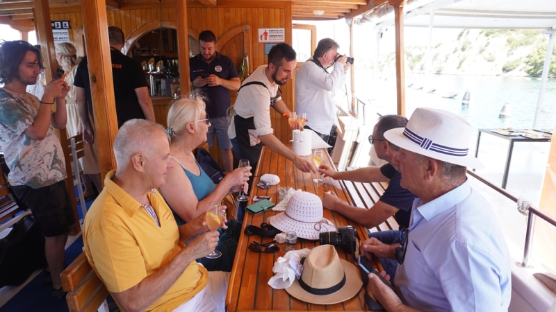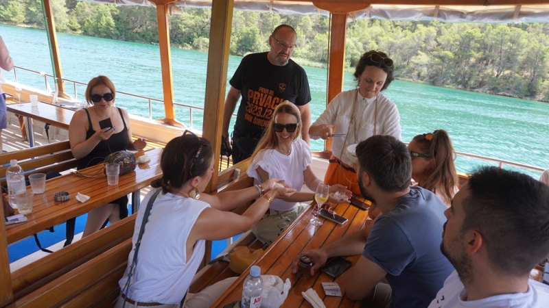 Na brodu ih je dočekalo i posebno iznenađenje, simbolični pokloni koje su osmislile Sanja Vukman i Antonija Škugor koje se bave storytellingom, uz ostalo i svileni rupčić, a svila je simbol Skradina u kojem se proizvodila , namočen u destilat ružmarina za osvježenje.