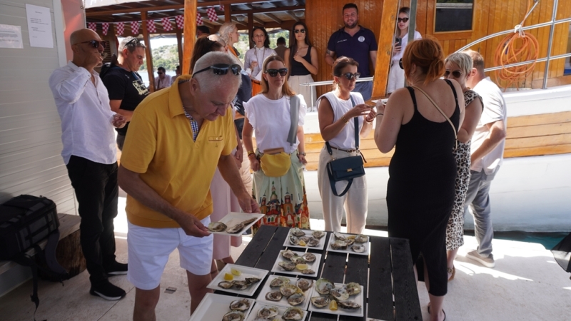 Prva stanica bilo je uzgajalište kamenica Platforme 0222 ispod Šibenskog mosta na kojoj su degustirali kamenice te ih zalili posebnim koktelom koji je samo za ovu priliku osmislio barist Tomislav Stančić. U njega je stavio šibensku travaricu, vino rose , ružmarin i šampanjac vinarije Testament,a uzvanici su mu davali ime.