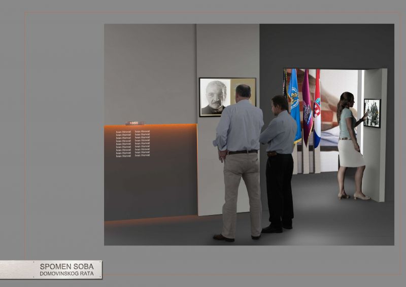 Na prelazu između centralne prostorije i projekcijsko izložbenog dijela, postavit će se interaktivni monitor - foto album na kojem posjetitelj sam pregledava fotografije s ratišta i razdoblja nakon rata, te se daje mogućnost braniteljima da stalno nadopunjuju fotografije s bojišta i proslave pobjede. Dio izložbenog postava činit će stjegovi braniteljskih postrojbi poredani na čeonom zidu, dok će se na bijelom zidu putem ovješenog stropnog projektora projicirati film sa ratnim zbivanjima. Na sredini prostorije postavit će se klupa, kako bi se moglo pogledati sadržaje, ali i zastati u tišini.