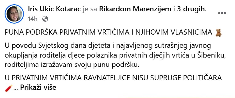 „U privatnim vrtićima ravnateljice nisu supruge političara” počinje svoje obraćanje Iris Ukić Kotarac i nastavlja: