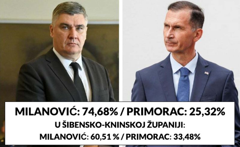Zoran Milanović voljom hrvatskih građana ponovno je izabran za predsjednika Republike Hrvatske. U drugom krugu predsjedničkih izbora premoćno je i uvjerljivo pobijedio predsjedničkog kandidata HDZ-a Dragana Primorca. Konačni rezultat je 74,68% glasova za Milanovića naspram 25,32% za Dragana Primorca. Milanović je pobijedio u svim hrvatskim županijama pa i Šibensko-kninskoj županiji gdje je za njega glasovalo 60,51% birača koji su izašli na izbore, a za Primorca 33,48% birača. Zoran Milanović u Šibensko-kninskoj županiji dobio je manje glasova od Dragana Primorca samo u gradu Drnišu te općinama Kijevo, Promina, Ružić i Unešić dok je u gradu Skradinu rezultat bio gotovo neriješen, ali je ipak pobjedu odnio Zoran Milanović.
