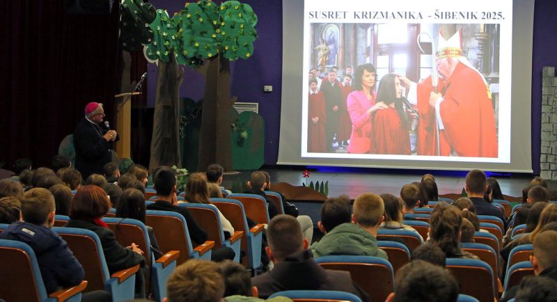 Susret ovogodišnjih kandidata za sakrament krizme, kojih je ove godine u Šibenskoj biskupiji oko 700, s biskupom Tomislavom Rogićem održan je Katoličkoj osnovnoj školi u Šibeniku, a vodio ga je biskupijski povjerenik za pastoral mladih don Ante Vrcić budući da je usret krizmanika podignut s dekanatske na biskupijsku razinu.