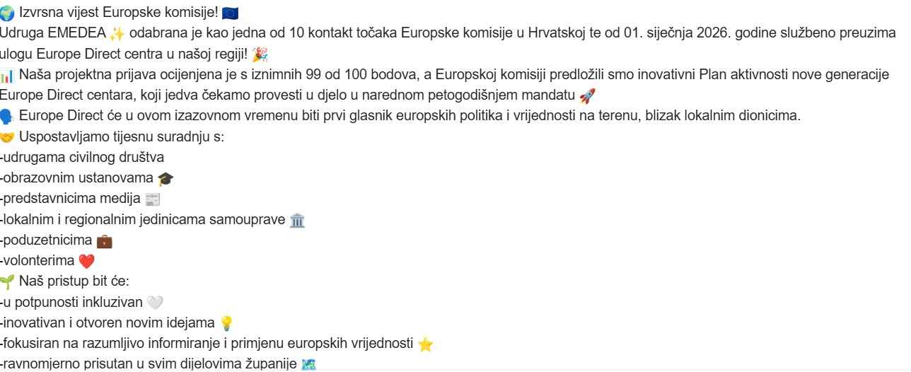 Izvrsna vijest za Šibensko – kninsku županiju stiže iz Europske komisije. Predstavništvo Europske komisije u Hrvatskoj odabralo je deset partnera iz Hrvatske s kojima će se u razdoblju od 2026. do 2030. godine provoditi okvirni sporazumi o partnerstvu. Partneri su izabrani na temelju natječaja objavljenog u svibnju 2025., a među njima je šibenska EMEDEA - Udruga za poticanje i promociju održivog razvoja, zapošljavanja i poduzetništva, kulture, športa, zdravog načina života i očuvanja okoliša.