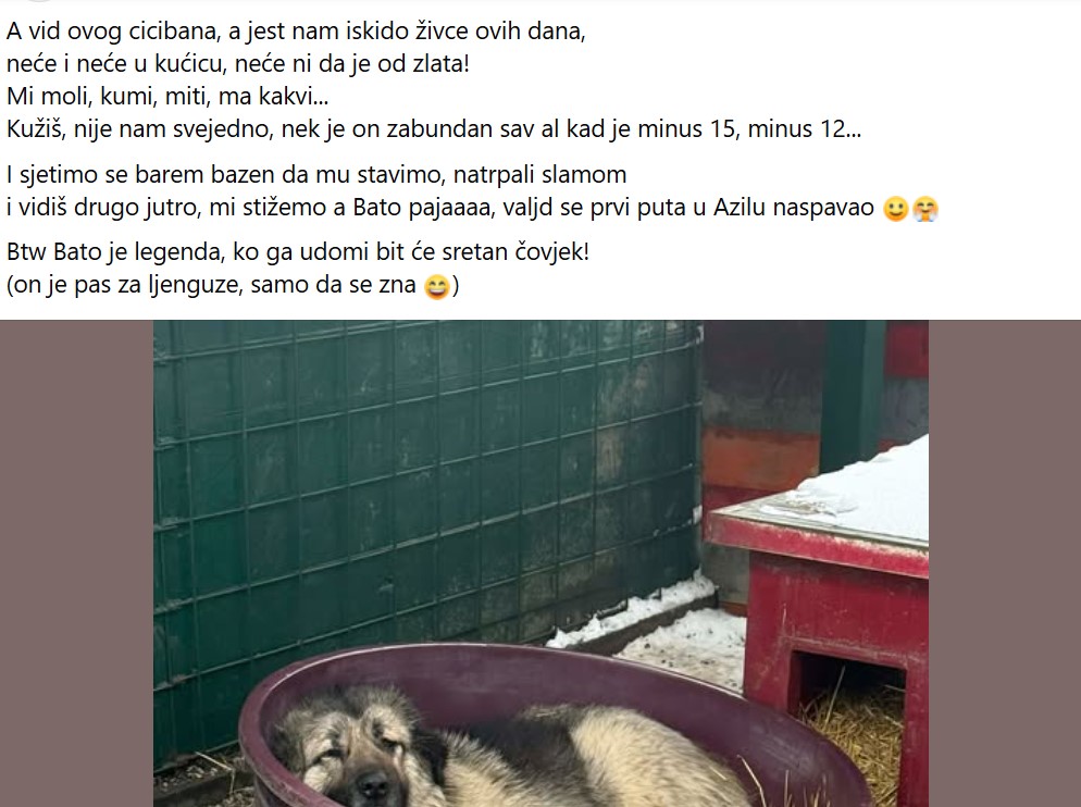 “A vidi ovog cicibana, a jest nam iskidao živce ovih dana! Neće i neće u kućicu, neće ni da je od zlata! Mi moli, kumi, miti, ma kakvi... Kužiš, nije nam svejedno. Neka je on sav 'zabundan', ali kad je minus 15, minus 12... I sjetimo se barem bazen da mu stavimo i natrpamo ga slamom”, napisali su, iskazujući time ljubav i brigu za psića, istovremeno pokušavajući dodatno animirati građane da ga udomite.