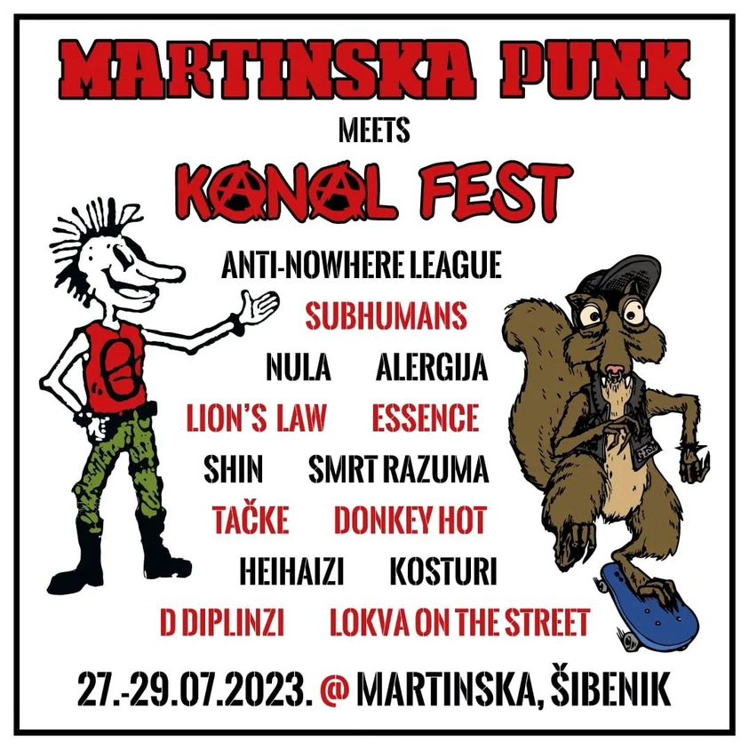 Jedna od najvećih punk fešti na prostoru Dalmacije i šire okupila je 14 bendova koji će nastupiti u tri dana, 27., 28., i 29. srpnja, na Martinskoj u Šibeniku. Festival koji je već sada željno iščekivan u cijeloj zemlji i regiji Martinska Punk meets Kanal Fest objavljuje raspored nastupa bendova po danima. Moguće je kupiti festivalsku, trodnevnu ulaznicu ili karte za svaki pojedini dan. Cijena za festivalsku ulaznicu je 35 eura, a za pojedini dan 15 eura, mogu se kupiti na poveznici.