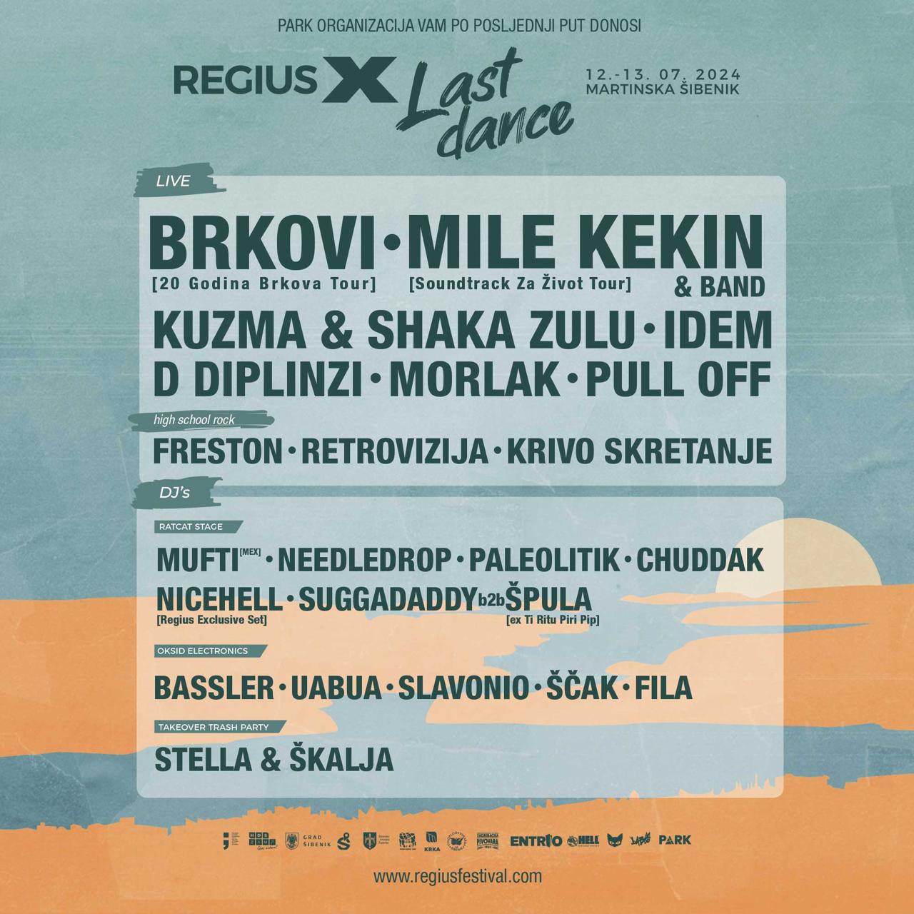 Jubilarno deseto i posljednje izdanje šibenskog Regius Festivala okupit će 12. i 13. srpnja na Martinskoj deset bendova, 13 DJ-a i tri domaće organizacije i kolektiva, Takeover, Oksid i RatCat koje će svojim programom ispratiti Regius na ‘Last Dance’.
