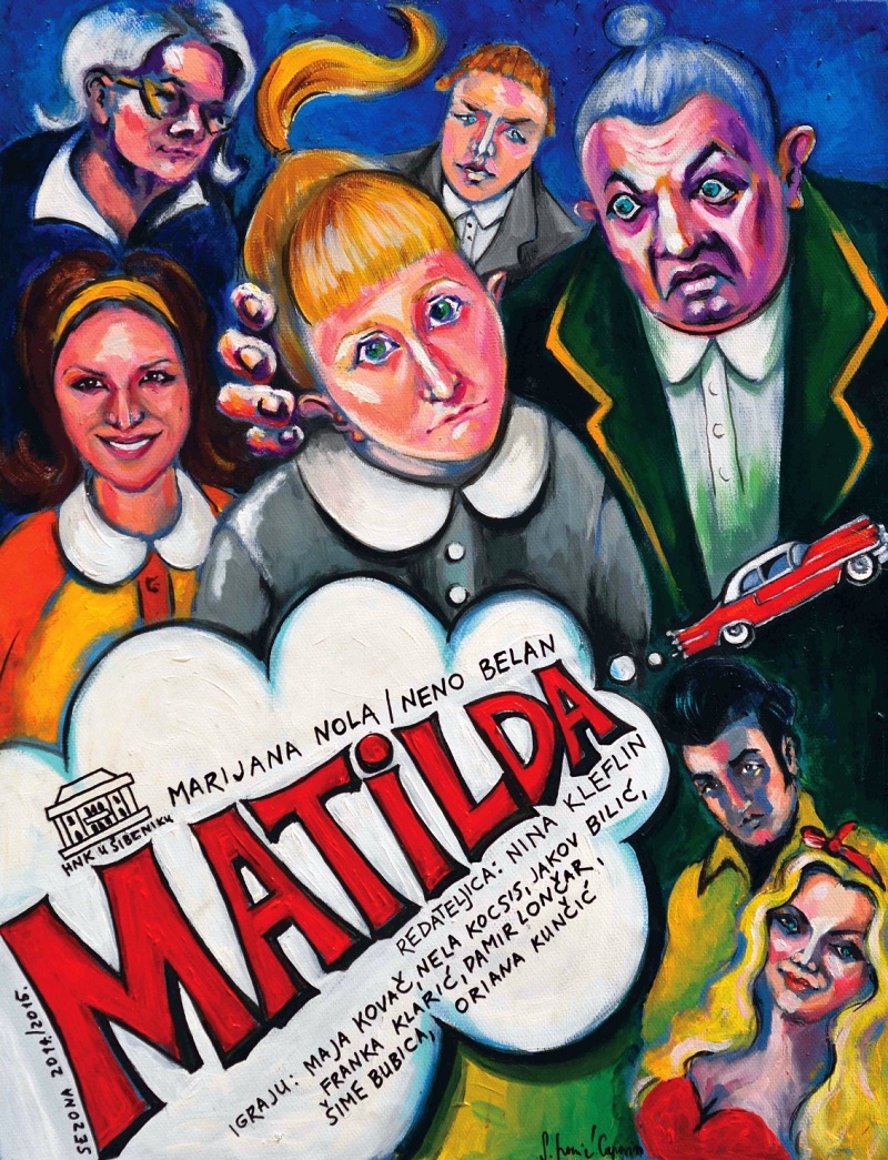 Jučer je u Ured MDF-a stigao svježe otisnut plakat za „Matildu“, koji potpisuje scenografkinja, kostimografkinja i kiparica Sara Lovrić Caparin. „Dok sam crtala skice za kostim, sinula mi je ideja da plakat napravim slikarskom tehnikom kakva se koristila u pedesetim i šezdesetim godinama prošlog stoljeća. Cijeli je plakat, dakle, naslikan ručno, bez ikakve kompjutorske obrade. Svojim slikarskim umijećem pokušala sam napraviti i relativno vjerne portere svih glumaca“, kaže Sara Lovrić Caparin.
