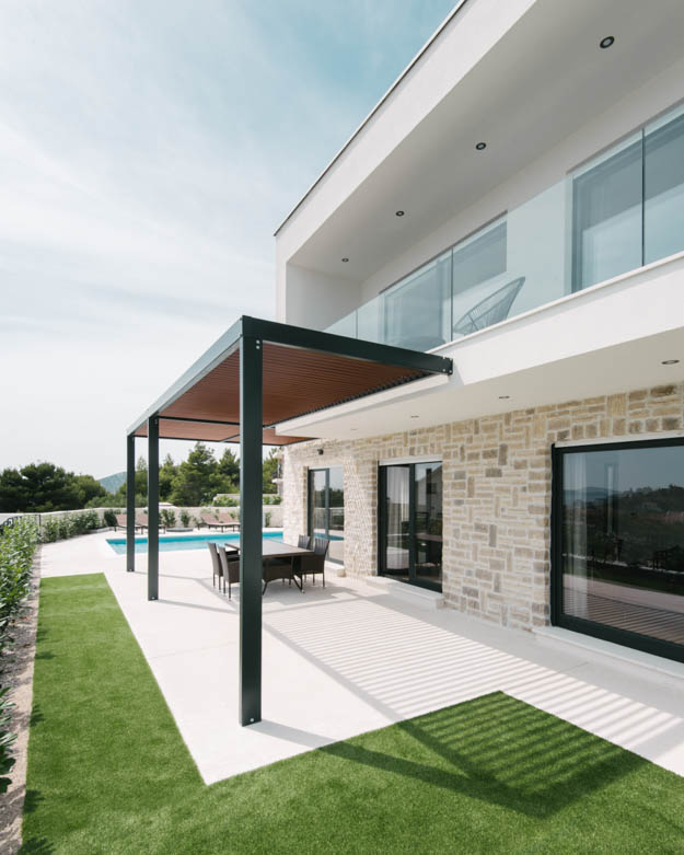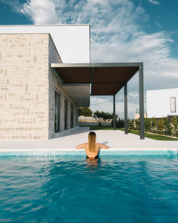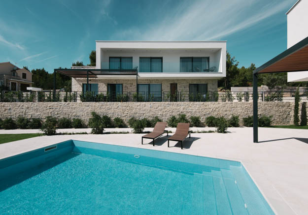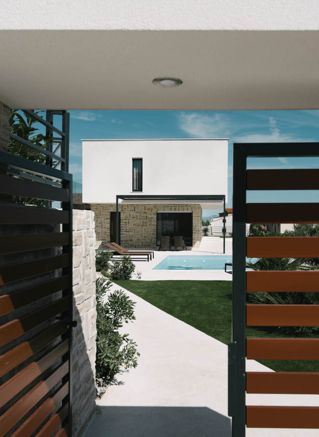 Unutar međusobno izmaknutih volumena prizemlja i kata smještaju se sadržaji koji čine vlastite prostorno-funkcionalne cjeline; u prizemlju su smješteni tako prostori boravka, dok se na katu nalaze spavaće sobe. Taj polaritet prenesen je na obradu i izgled pročelja, pri čemu se prizemlje oblikuje tradicionalnim dalmatinskim materijalom koji "nosi" bijeli volumen kata. Neizostavna i vrlo atraktivna stavka u cijelom projektu jest bazen koji se savršeno uklopio u ovaj dvostruko sjajno izveden projekt, prenosimo s portala Buro.