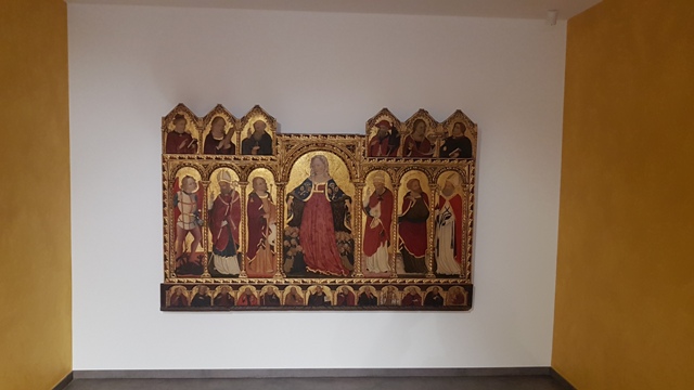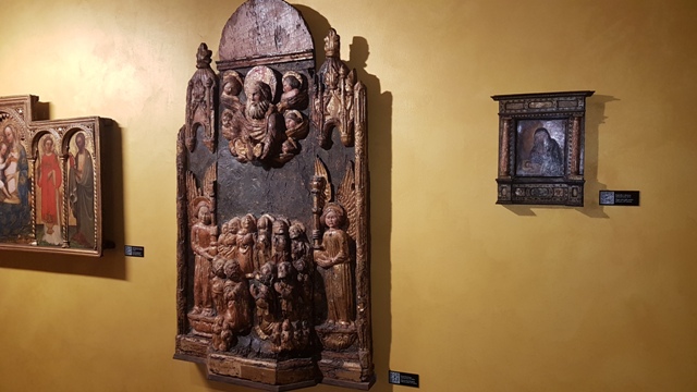 Na međukatu te prvom i drugom katu do kojih vode stepenice u obliku skele je likovni postav s restauriranim umjetninama iz bogate riznice šibenske biskupije koje se na taj način prvi put pokazuju javnosti. Izdvajaju se djela Jurja dalmatinca, Nikole Firentinca , Nikole Vladanova, Blaža Jurja Trogiranina. Tu su i i bogata riznica liturgijskog ruha, liturgijskog posuđa, misali, evanđelistar iz 11 stoljeća. Izložen je i Ugovor koji je Juraj Dalmatinac potpisao prilokom početka gradnje katedrale, ali i zrno koje je 1991. godine, u topničkom napadu na Šibenik oštetilo kupolu katedrale.