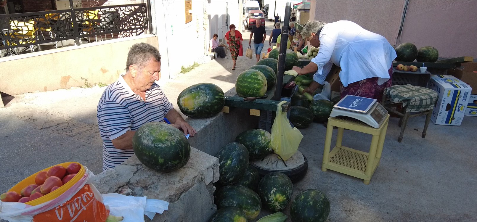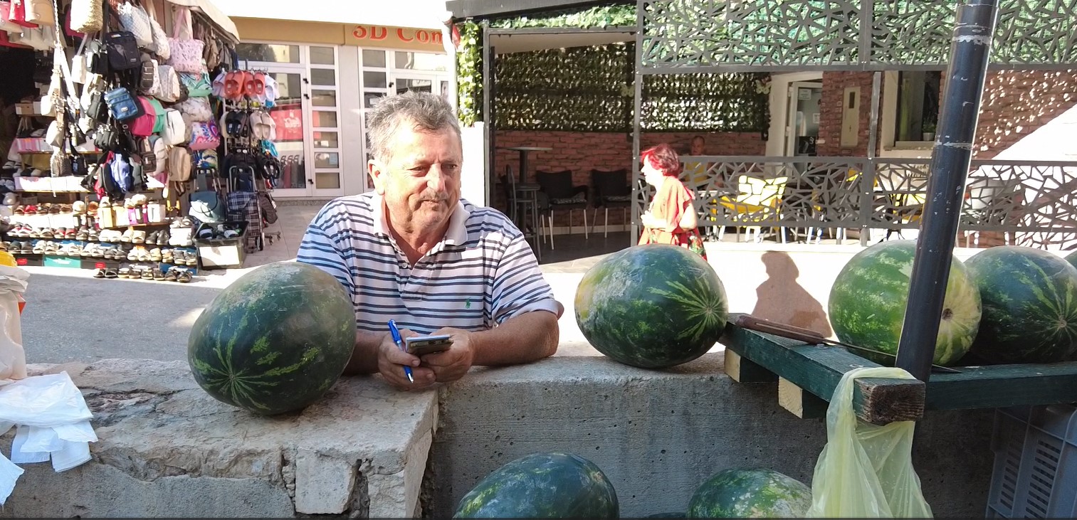 „Ja imam svoj jabučnjak i proizvodim jabuke i imao sam ih nekoliko kašeta kod sebe.Jedna mi je baka ponudila da prodajem pokraj nje i tako je krenulo. Znao sam da u šibenskom zaleđu ima grožđa i maslina, ali ne i jabuka. Počeo sam ih prodavati na pijaci i išlo je odlično. Dovezao sam za prodaju i svoj kukuruz šećerca i malo pomalo tu smo se etablirali i doselili . Danas smo tu pet ili šest dana i onda odlazimo po robu u Slavoniju. Imam voćnjak i u njemu devet vrsta jabuka koje ja i supruga prodajemo na šibenskoj pijaci, kroz cijelu sezonu. Od njih pravimo i jabučni ocat. Sameljemo ih, stavimo ih u kacu, i nakon šest mjeseci, kad jabučni sok fermentira, ocijedimo ih i to je to! Nema kemije ni ikakvih drugih postupaka”, otkriva nam Milan.
