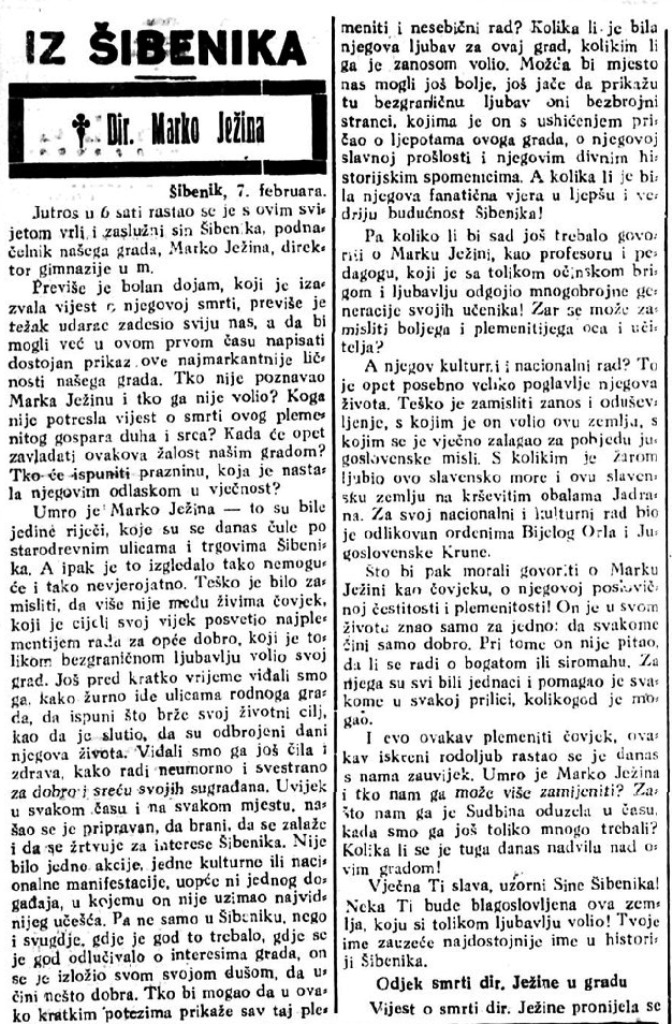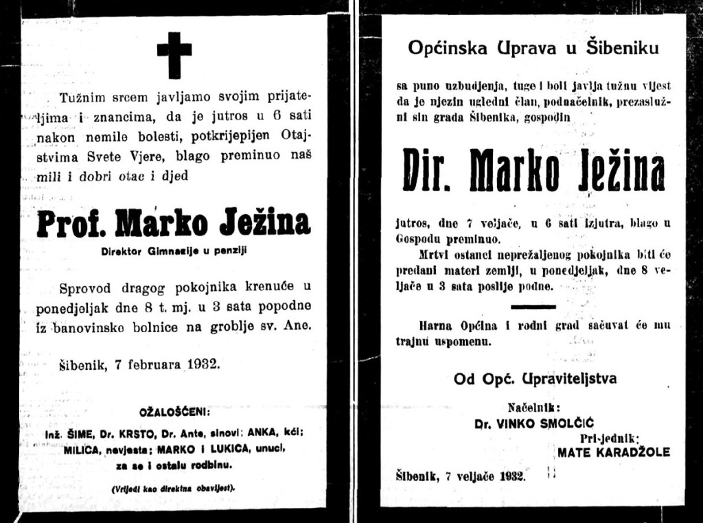 Marko Ježina, prvi direktor šibenske gimnazije od njenog osnutka 1916. godine, umro je na današnji dan 7. veljače 1932. godine.
