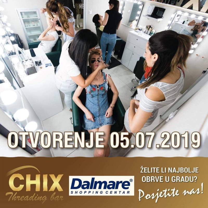 Na prvoj etaži shopping centra Dalmare, tik pokraj high street brenda Mango, otvara se jedan od najpopularnijih threading barova u Hrvatskoj - Chix threading bar, čiji će se stručni tim pobrinuti da iz salona izađete spremni za modnu pistu – precizno oblikovanih i obojenih obrva u skladu sa s licem, make upom i bojom kose. Svi koji požele, mogu napraviti i minival trepavica, obojiti ih, ali i naručiti se na kompletan make up za posebne prigode. Ili naprosto zato što želite sebi biti posebni!