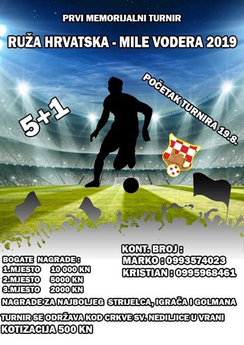 "Velika čast i zadovoljstvo nam je, nakon dugih 7 godina neodržavanja, najaviti malonogometni turnir koji će se održati u Vrani. Turnir organiziramo u čast na nedavno preminulog našeg prijatelja, suigrača i hrvatskog branitelja Milu Vođeru. Turnir će se održati na igralištu kod crkve sv. Nediljice. Početak turnira je 19.08.2019, a izvlačenje parova je 17.8. 2019 godine u 18:00 h na igralištu. Zadnje prijave ekipa -17.8 do 17:00, nakon izvlačenja parova sve Vas pozivamo na tradicionalnu manifestaciju Vitezova vranskih gdje će naši vitezovi pokušati osloboditi Vranu od turske okupacije", kažu organizatori koji su pripremili i dobru zabavu i bogate nagrade.