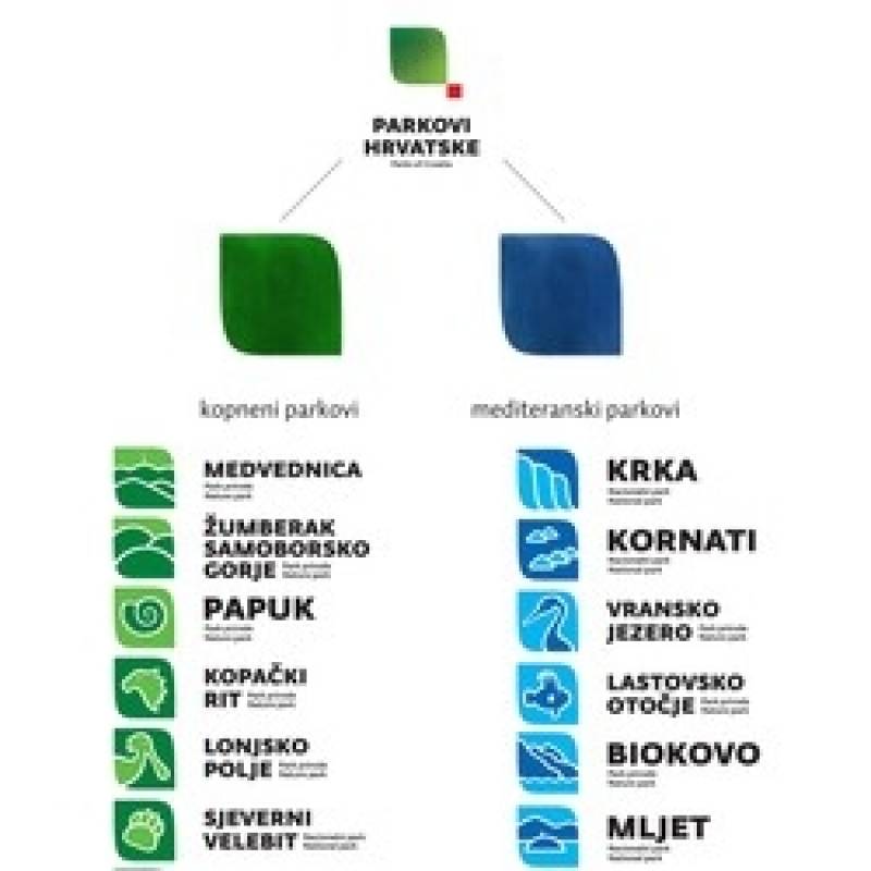 Ukupno 19 znakova nacionalnih parkova i parkova prirode figurativni su motivi koji predstavljaju najprepoznatljivije elemente pojedinog parka, pa je tako primjerice lički medvjed simbol Plitvičkih jezera, slapovi simbol Krke, vuk je simbol Velebita, a orao štekavac simbolizira Kopački rit. Grupni vizualni identitet osmišljen je tako da svaki pojedinačni znak funkcionira zasebno, ali su svi izvedeni istim grafičkim jezikom što se pokazalo uspješnom praksom u mnogim zemljama - Francuskoj, Norveškoj, SAD-u.
