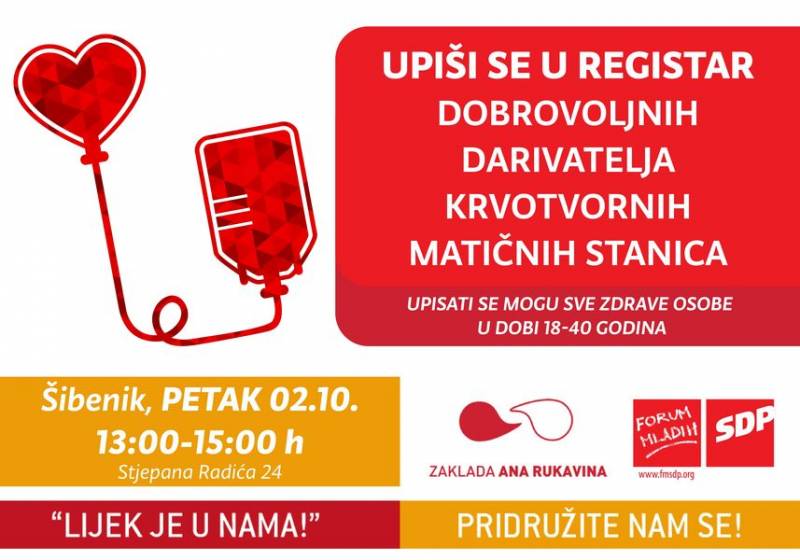 Pozivamo sve žitelje Šibensko-kninske županije, a posebno sve Šibenke i Šibenčane u dobi od 18 do 40 godina, da nam se priključe na akciji upisa u Registar dobrovoljnih darivatelja krvotvornih matičnih stanica, stoji u priopćenju Foruma mladih SDP-a.