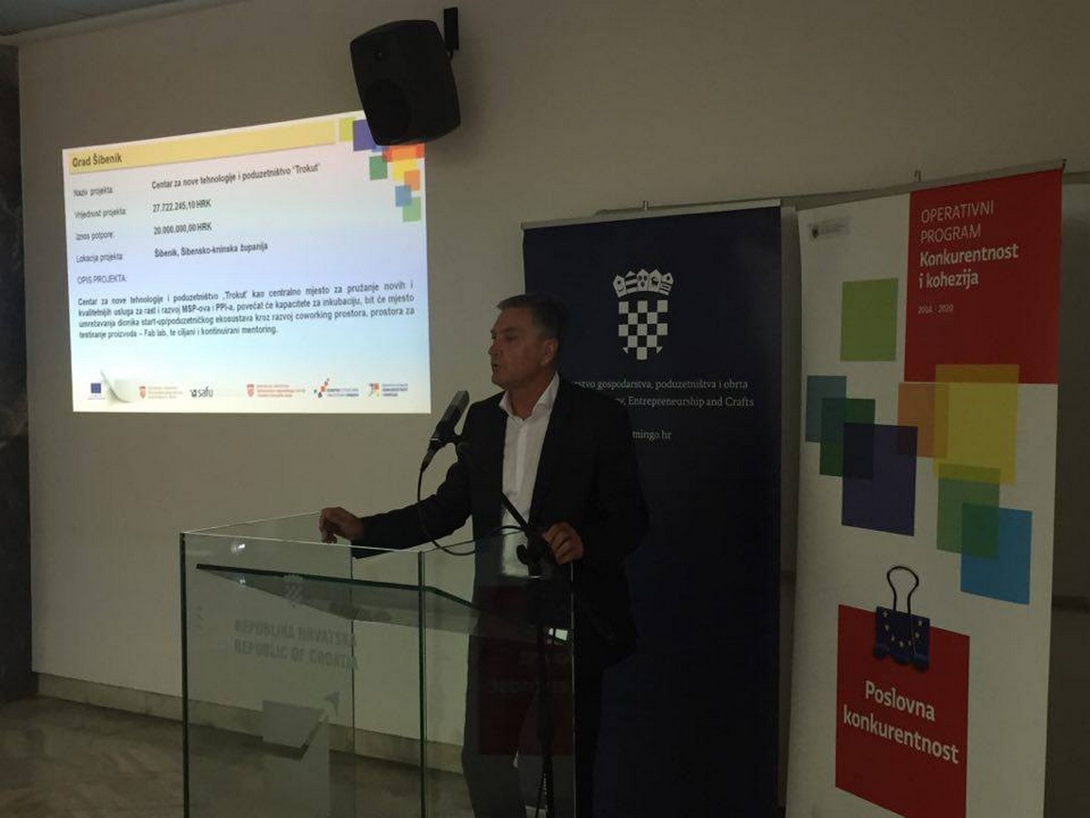 Među 23 projekta, ukupno vrijedna 368 milijuna kuna za koje je danas u Zagrebu, u Ministarstvu gospodarstva, poduzetništva i obrta, u nazočnosti ministrice Martine Dalić, potpisana Odluka o financiranju je i šibenski projekt Centra za nove tehnologije i poduzetništvo – Trokut za koji je Grad Šibenik dobio 20 milijuna kuna bespovratnih sredstva Europske unije putem natječaja Europskog fonda za regionalni razvoj, Razvoj poslovne infrastrukture, Operativni program "Konkurentnost i kohezija 2014.-2020.“
