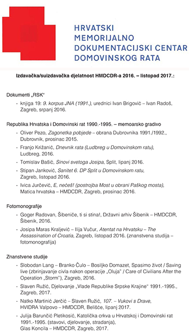 Promocija će biti održana danas u 17 sati u velikoj čitaonici Državnog arhiva u Zagrebu, a na njoj će biti predstavljeno 13 knjiga i monografija koje je HMDCDR izdao sam ili u suradnji s drugim institucijama tijekom 2016. godine i do listopada 2107. godine.