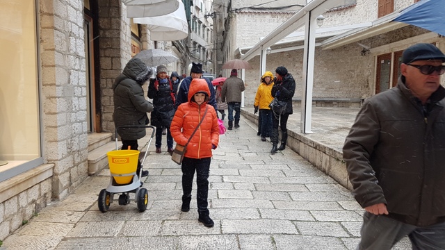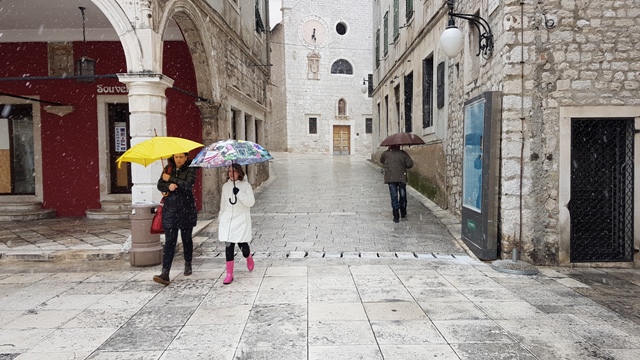 FOTO Prvi ovogodišnji snijeg u Šibeniku i turisti u šetnji gradom