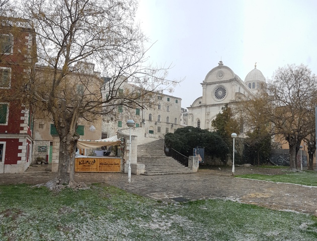 Prvi ovogodišnji snijeg u Šibeniku nije prouzročio veće probleme u prometu ni kretanju pješaka, a turistima koji su jutros stigli u Šibeniku priredio je prizore koji se rijetko vide. U Šibeniku su stigli kruzerom.