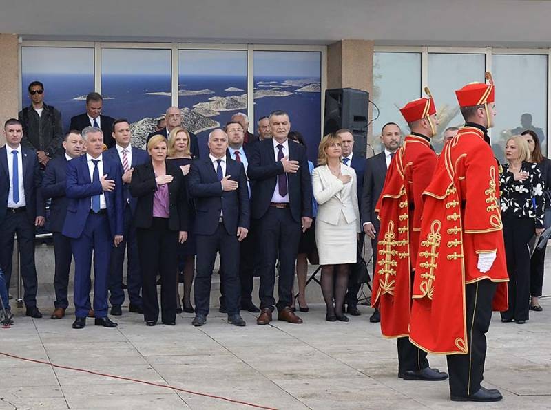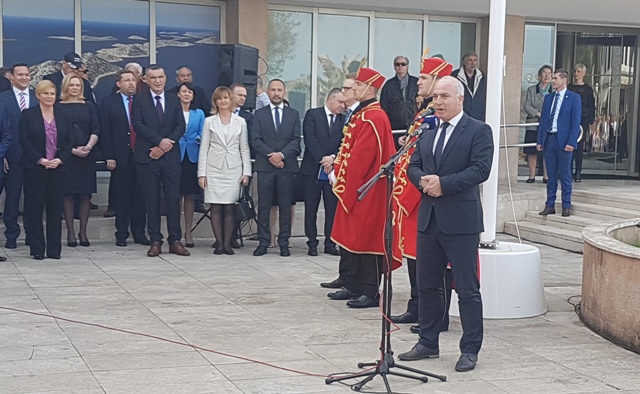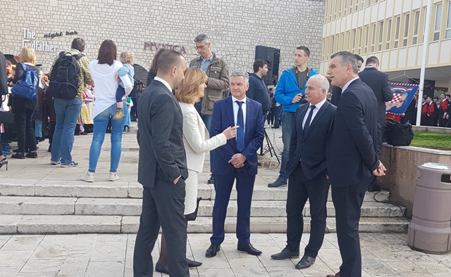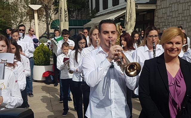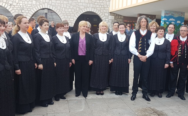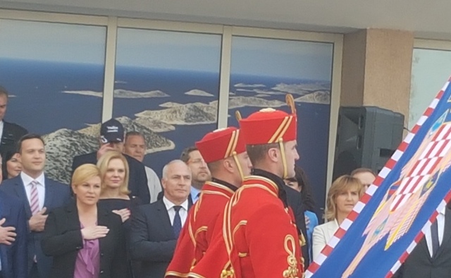 Predsjednica Grabar Kitarović kazala je kako joj je drago što je konačno u gradu za koji je vezana i obiteljski. Prvo je zahvalila učeniku Gimnazije Antun Vrančić Srećku Perkoviću koji je podignuo zastavu na trgu ispred Županije i Pjevačkom društvu Kolo čiji su članovi izveli himnu.