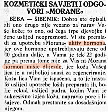 Konačno, kada ih je umirio, sudac je saznao da te četiri ljepotice lovile miševe i pantagane zato što su u novinama pročitale da će im lica uvijek biti sjajna, mlada i bez bora ako je budu njegovale hormonom mišje žlijezde. Kao dokaz pokazale su sucu isječak "Kozmetički savjeti i odgovori Morane" iz splitskih novina "Novo doba". U tom članku tvornica sapuna i kozmetičkih preparata "Morana" odgovara na pismo Šibenčanke koja se potpisala kao Beba i objašnjava joj da je aktiv hormona mišje žlijezde najbolji za zatezanje i regeneriranje kože lica.