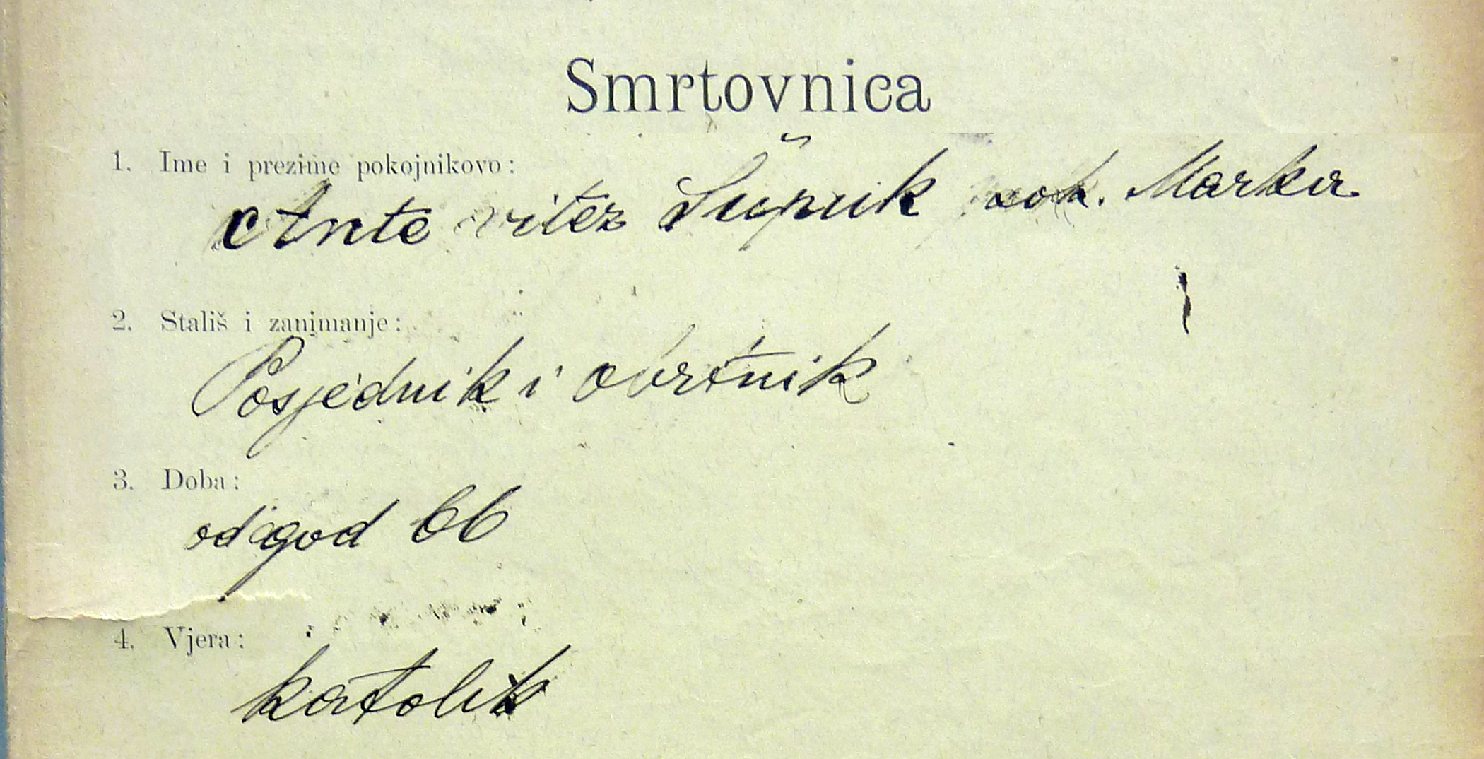 Prema Smrtovnici A219/904/2 Ante vitez Šupuk, pokojnog Marka, posjednik i obrtnik, po vjeroispovijesti katolik, oženjen, nastanjen u Šibeniku sa stalnim prebivalištem u kući Makalina obala, umro je u šezdeset šestoj godini 11. svibnja 1904. godine u stojnoj kući u Šibeniku. Kao preostali ženidbeni drug navedena je njegova supruga Pilomena, rođena Carbonetti.