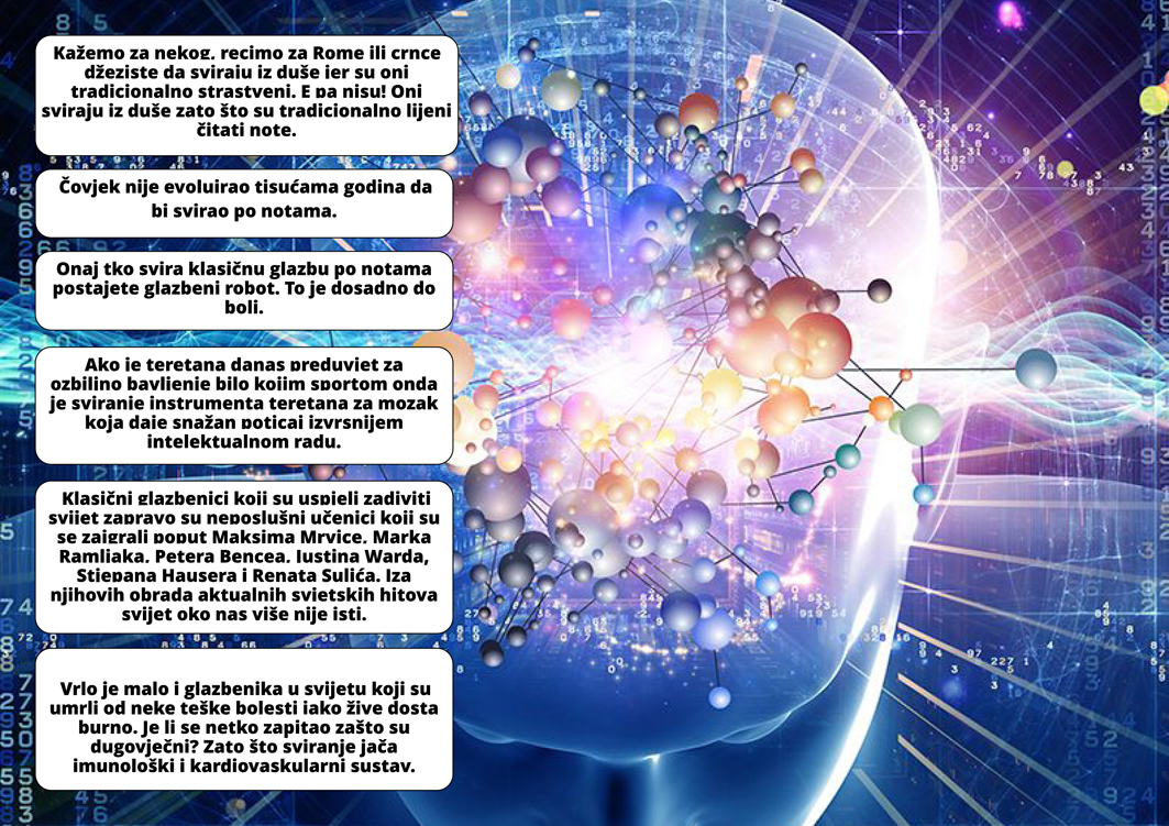 Polinstrumentalni pristup, dakle sviranje više instrumenata, tvrdi on, ne samo da vodi širem spektru utjecaja na intelekt, povećava IQ i memorijske sposobnosti već i značajno ubrzava napredak sviranja svakog pojedinog instrumenta. Svoja zapažanja i zaključke pod nazivom „Utjecaj glazbe i aktivnog sviranja na razvoj i funkcioniranje mozga te mogućnost implementacije tih saznanja u radnoj terapiji pacijenata s kognitivnim deficitom“, predstavit će i na skorašnjem 7. kongresu Hrvatskog psihijatrijskog društva u Opatiji. Ta je tema važna i za širu javnost jer može pomoći svakom pojedincu u njegovom intelektualnom razvoju, poboljšati školski sustav te unaprijediti terapiju bolesnika s duševnim poremećajima. O svemu tomu više pročitajte u vrlo zanimljivom intervju u na linku: