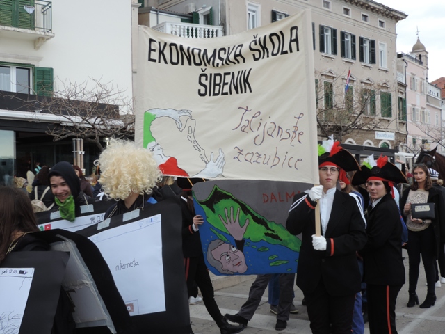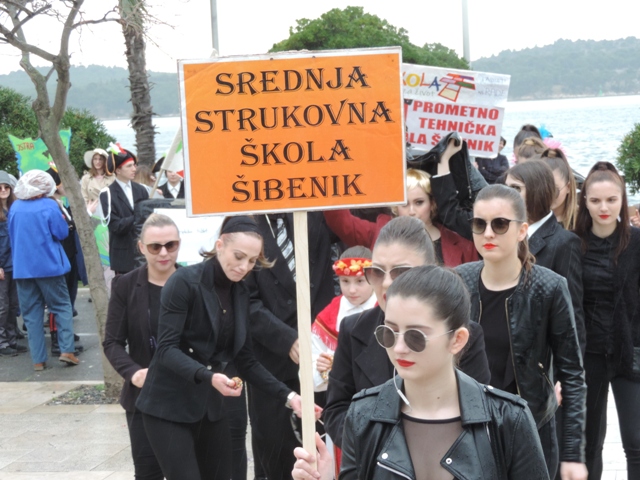 Tako su učenici Gimnazije Antuna Vrančića dočarali "doček vatrenih" u kojem je sudjelovala i predsjednica Kolinda Grabar Kitarović,a njoj su bili posvećeni i kostimi Strukovne škole koji su predstavljali šminkere i frizere koji brinu o tomu da predsjednica bude uvijek lijepa i dotjerana tako da su hodali u špaliru oko nje, a kako je počela padati kiša odmah su je zaštitili da ne bi pokisnula. Ekonomska škola se referirala na Talijanske pretenzije prema Dalmaciji, a Industrijsko - obrtnička škola je dočara što znači brzi autobusni prijevoz. Medicinska škola je predstavljala Imunološki zavod sa cjepivima, Prometna škola moderne gadgete...