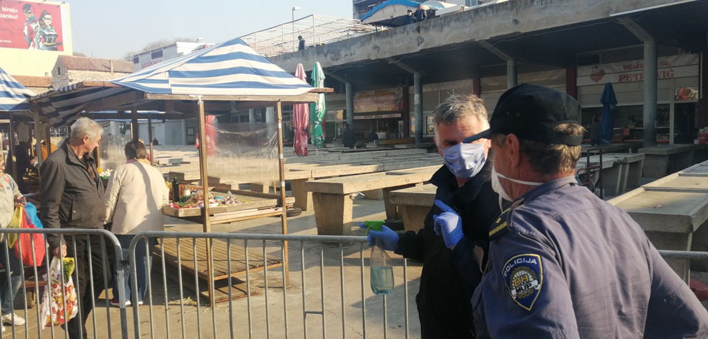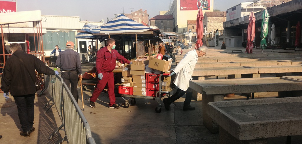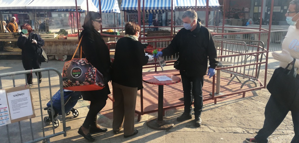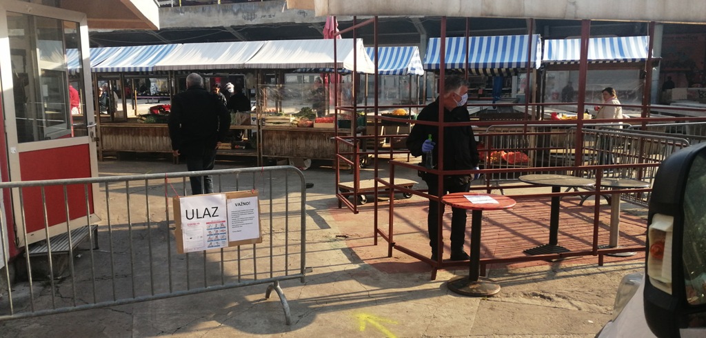 Tržnica je ograđena tako da se na jednom mjestu ulazi, a na drugom izlazi. Na ulazu je zaštitar s kemijskim sredstvima za dezinfekciju ruku. Održavanju reda pomaže policija i komunalni redari. Roba se prodaje samo na natkrivenim drvenim štandovima dok su središnji banci prazni. Između prodavača i kupaca je barijera od najlona tako da kupci ne mogu robu dodirivati. Na ograđenu tržnicu ulazi odjednom ograničeni broj kupaca.