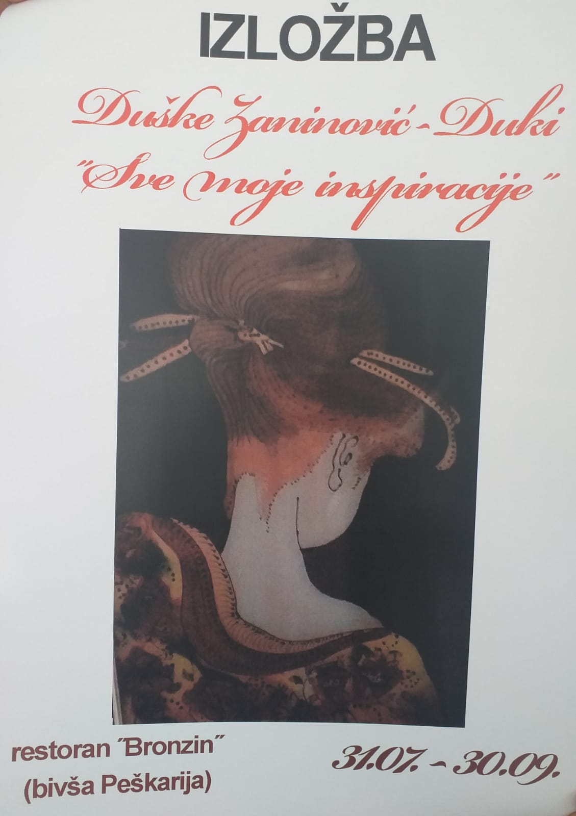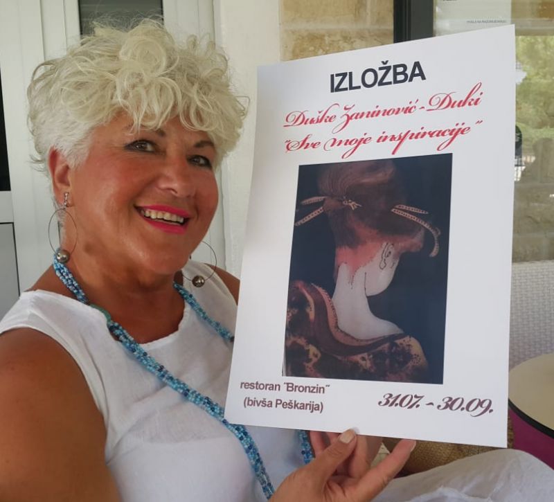 "Sve moje inspiracije" naziv je izložbe Šibenčanke Duške Zaninović Duki koja će biti otvorena večeras u 19.30 sati na teresi restorana Bronzin (bivša Peškarija) u Šibeniku. To je 8. samostalnu izložbu te svestrane žene i umjetnice koju javnost dobro poznaje i iz kulinarskih show emisija.