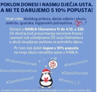 Učenici Osnovne škole Jurja Dalmatinca prikupili su poklone za svih 124 djece koji žive u Domu za nezbrinutu djecu Maestral i u subotu su im ih zapakirane poslali. Snimli su za njih i dirljivu Božićnu čestitku. U poklon paketima su odjeća, školski pribor i igračake. Tu je akciju uz potporu ravnatelja te škole Natka Duvnjaka pokrenula učiteljica Ivana Vlaić i njezin prvi razred. Nakon što su zapakirali i poslali sve poklone za djecu u domu Maestral u akciji koja je krenula od učiteljice Ivane Vlaić, učenici Osnovne škole Juraj Dalmatinac snimili su i božićnu video čestitku.