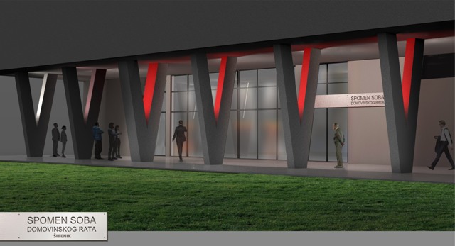 Zgrada u kojoj se nalazi prostor buduće spomen sobe u svojoj arhitekturi ima nosive stupove koji su u obliku slova „V“ koje su projektanti odlučili iskoristiti kao dio postava, tj. snažnog prvog dojma kod prilaska spomen sobi. Stupovi, koji će prethodno biti sanirani i obojeni, bit će osvijetljeni s unutrašnje strane, naglašavajući „V“ kao simbol pobjede.