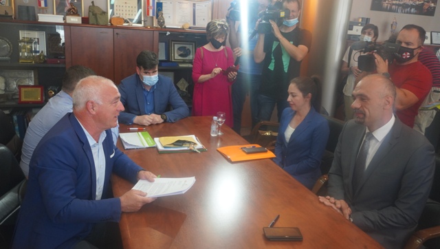 Nakon što su jedna drugom predali službeno izvješće pred kamerama spustili su se ispred zgrade Županije kako bi dali izjave novinarima.