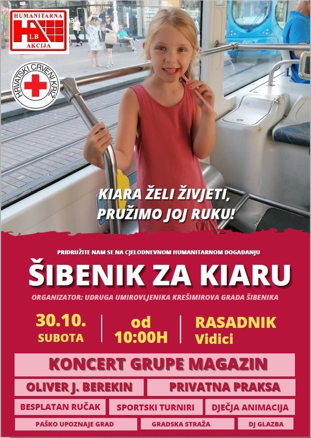 „Šibenik za Kiaru!” naziv je dobrotvornog druženja koje sutra (subota 30. 10.) u Rasadniku na Vidicima organiziraju Udruga umirovljenika Krešimirova grada Šibenika i Crveni križ Šibenik. Druženje počinje u 10 sati, a sav prihod namijenjen je liječenju djevojčice Kiare.