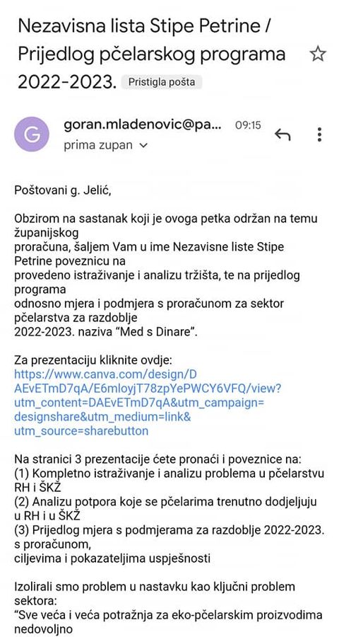 “Prije otprilike 20 dana sam gospodinu županu Marku Jeliću poslao mail sljedećeg sadržaja, na koji nisam dobio odgovor. Radi se konkretnoj gospodarskoj mjeri koju nudim kao županijski vijećnik NL Stipe Petrina svojim stranačkim kolegama i stručnjacima koji su s nama radili na projektu. Poslao sam prezentaciju u kojoj govorimo o sadašnjem katastrofalnom stanju u sektoru pčelarstva i gdje nudimo primjenjiva rješenja. Dokument od oko 100 STRANICA, kako i gdje pomoći našim medarima u Županiji da postanu brend i da gospodarstvo u našoj županiji krene uzlaznom putanjom.Ako meni kao županijskom vijećnika NL Stipe Petrine i partneru u koaliciji gospodin župan Marko Jelić nije odgovorio na ovako konstruktivan prijedlog, što Vi ostali možete očekivati?!”, obratio se građanima na toj društvenoj mreži Mladenović dodavši kako je točno da oni imaju dožupanicu iz svojih redova, ali da je i ona nemoćna tu nešto primijeniti.