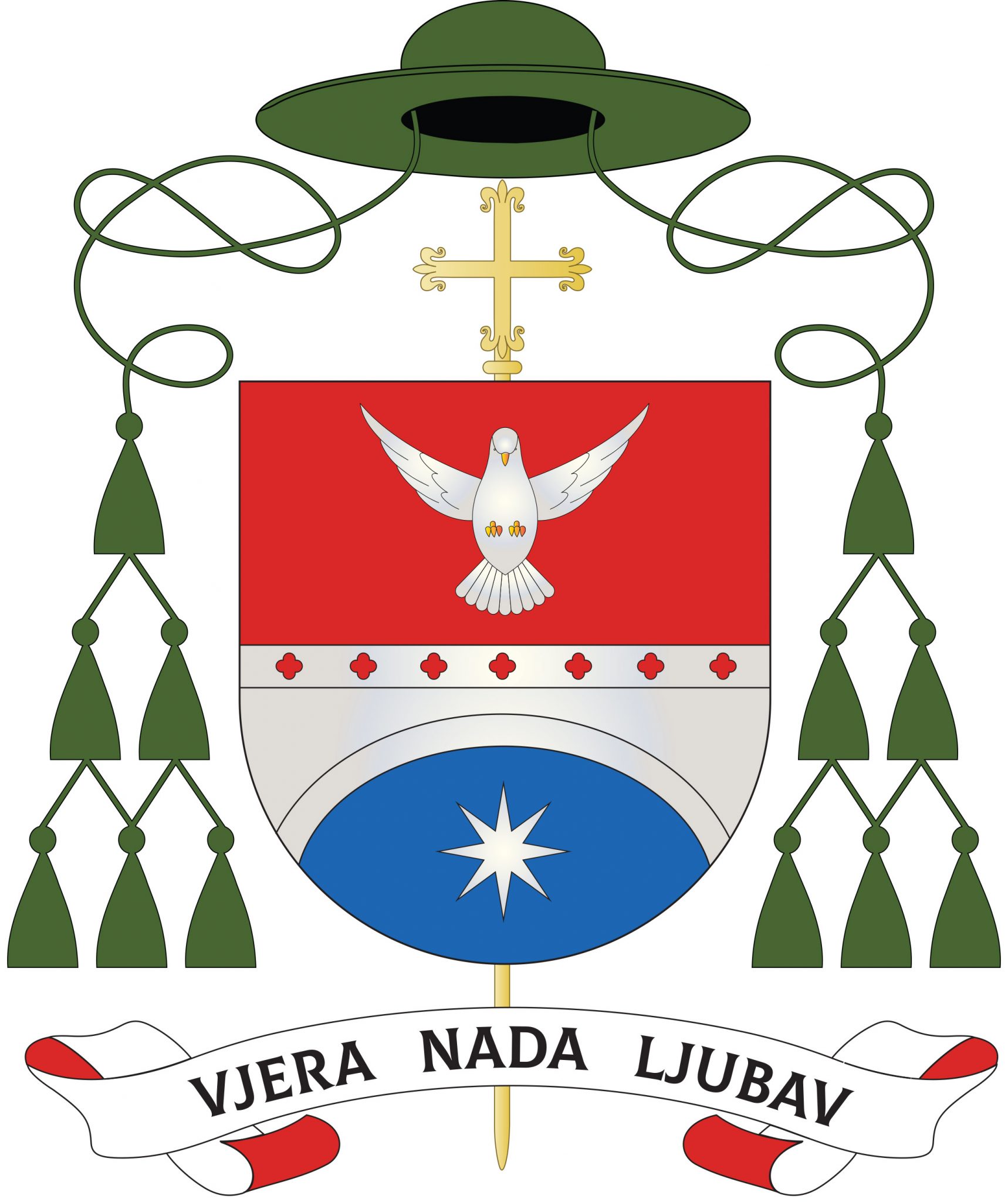 (crveno-srebrna), ali i boje Republike Hrvatske. Na traci ispod štita nalazi se ispisano biskupsko geslo „Vjera – nada – ljubav“ čiji simboli se čitaju i u elementima grba (vjera – zlatni križ; nada – zvijezda; ljubav – most) i u bojama štita (vjera – plava; nada – srebrna; ljubav – crvena). Kako bi se istaknulo jedinstvo sa Svetom Stolicom, ali i kao znak povezanosti sa sadašnjim nasljednikom sv. Petra, geslo je ispisano na istom obliku trake kako se nalazi i na grbu pape Franje.