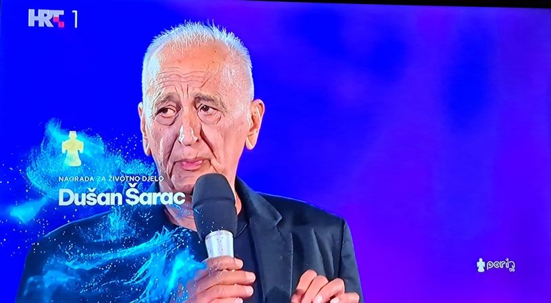 Maestru Dušanu Šarcu uručena je večeras, na svečanosti dodjela Porin ta nagrada za životno djelo. Tom prigodom o njemu su govorili njegov prvi suradnik u organizaciji Festivala dalmatinske šansone Branko Viljac, Branimir Bubica i Gabi Novak, a nagradu mu je uručio njegov dugogodišnji suradnik i sugrađanin Siniša Škarica. Istaknuo je kako je Šarac svestrani glabenik podsjetivši na njegov glazbeni put od uspješnog violiniste, glazbenog pedagoga do umjetničkogravnatelja Festivala dalmatinskih klapa u Omišu i umjetničkog direktora Večeri dalmatinske šansone u Šibeniku. „U njegovoj kajdanki je više od 800 skladbi”, istanuo je.