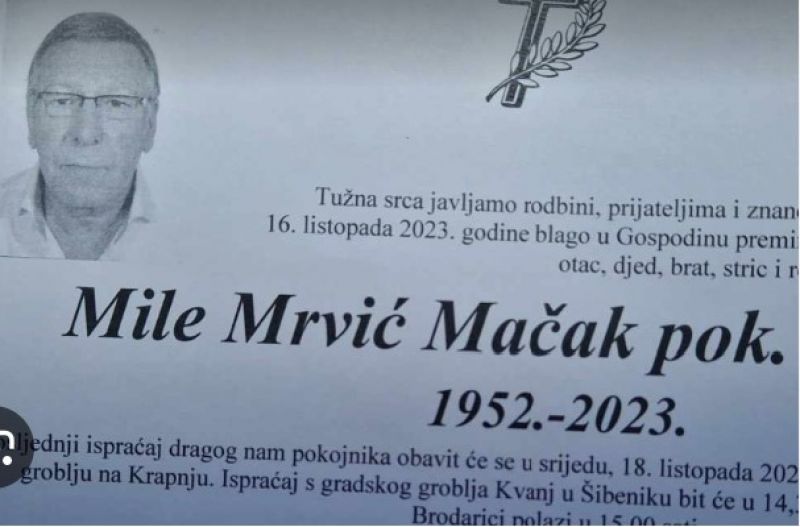 Mile Mrvić Mačak bit će pokopan danas, u srijedu, u 15 sati na mjesnom groblju na otoku Krapnju, dok će ispraćaj s Kvanja biti pola sata prije, u 14. 30 sati.